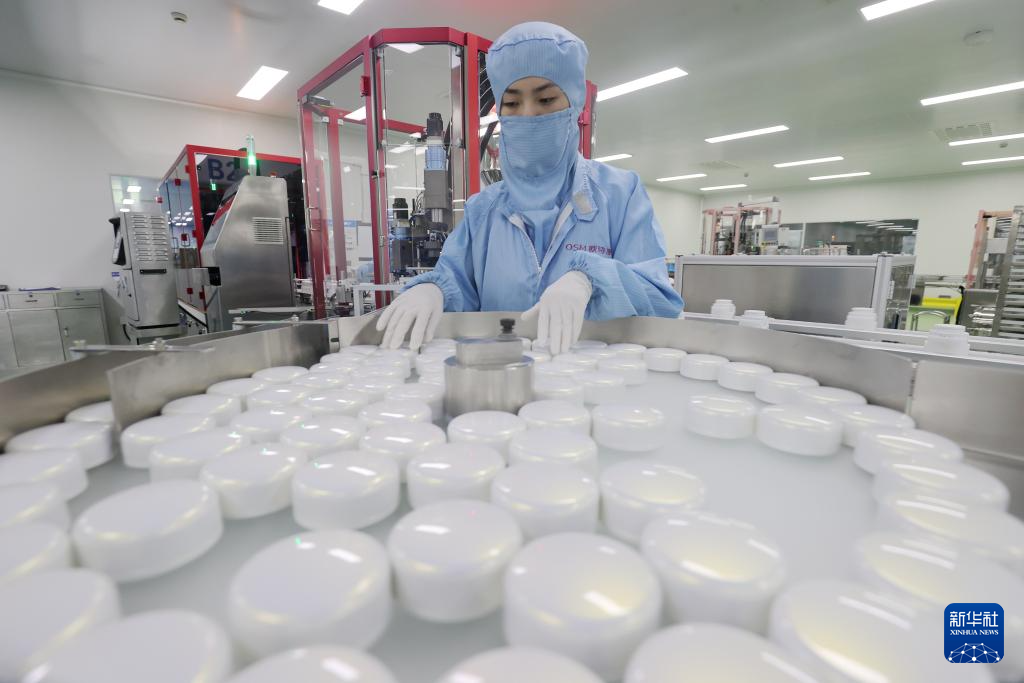 5月21日,浙江省湖州市德清县一珍珠生产企业工人在化妆品生产线上忙碌。