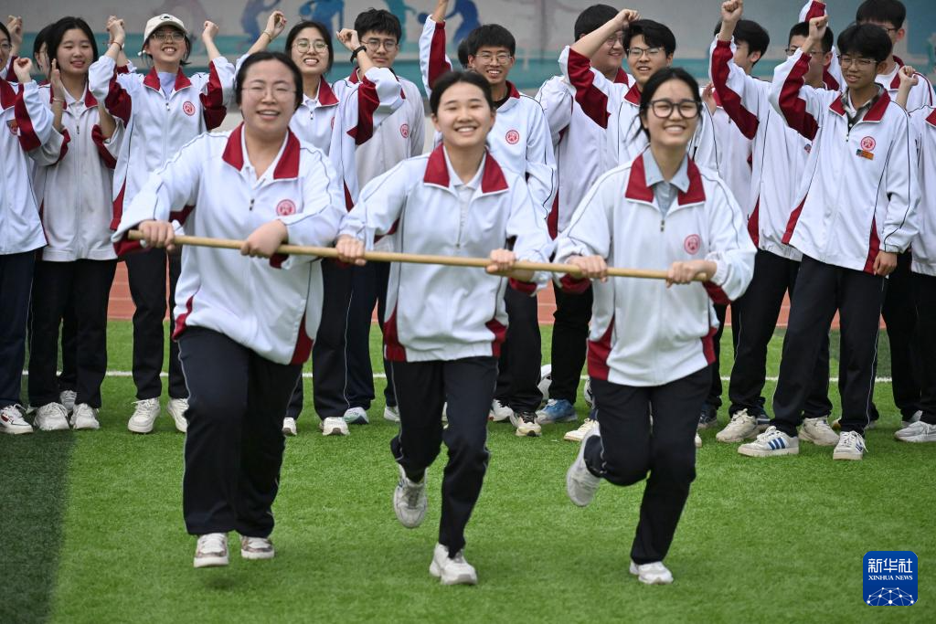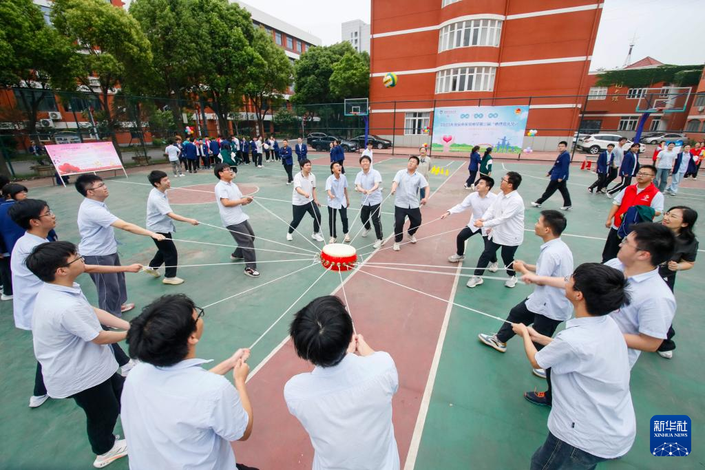 5月22日,江苏省海安市实验中学高三学生在体验“同心击鼓”游戏。