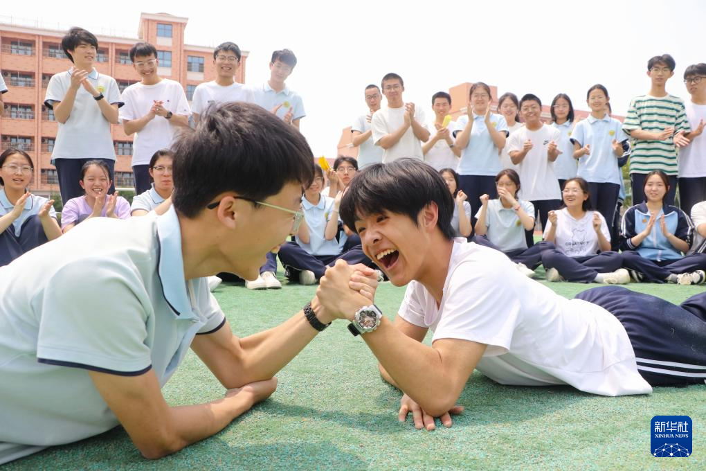 5月22日,在山东省高密市第五中学,高三学生比赛掰手腕。