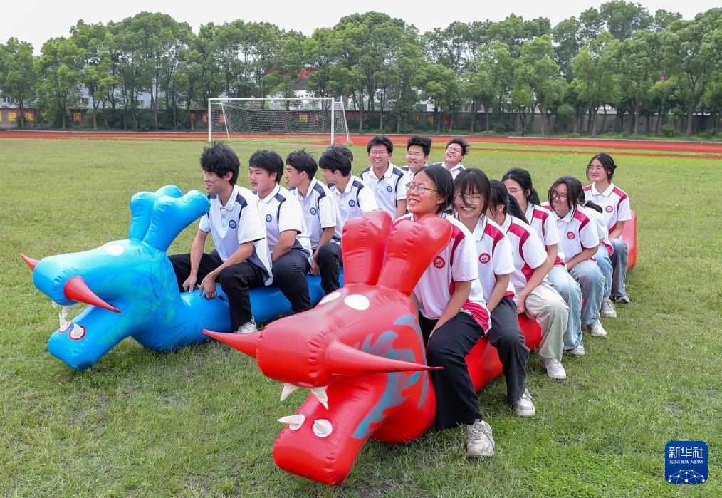 5月22日,在江苏省泰州市姜堰区罗塘高级中学,高三学生进行“旱地龙舟”比赛。