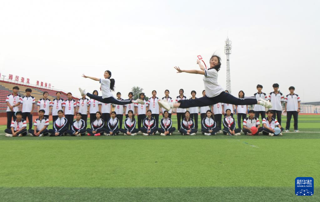 5月22日,河北省石家庄新乐市第四中学高三学生进行“一字马”游戏表演。