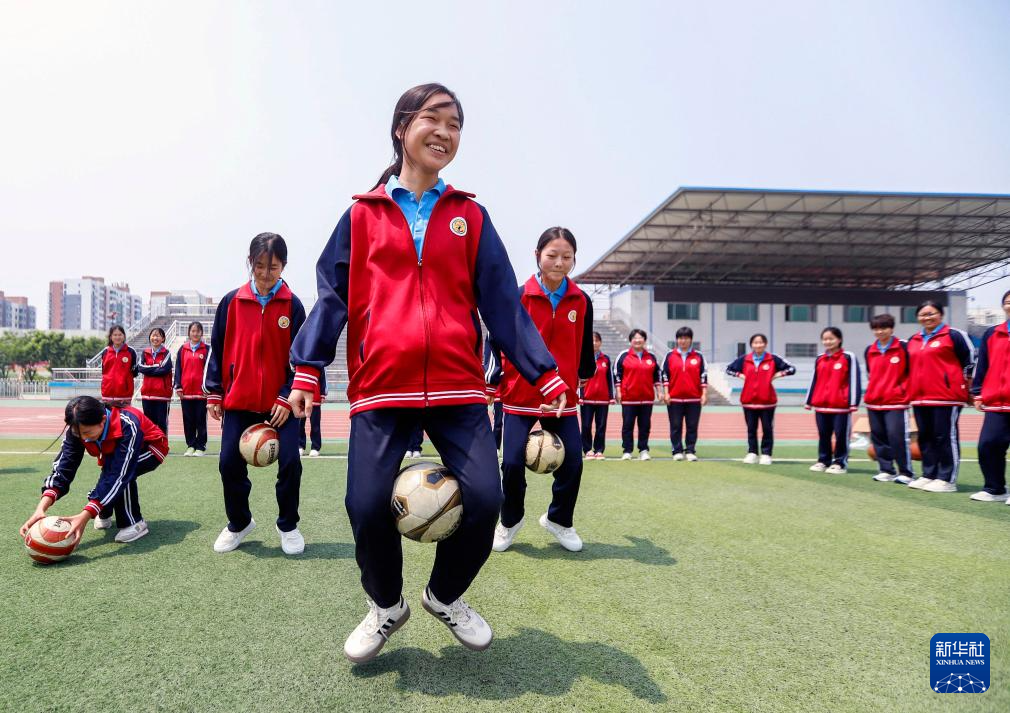 5月15日,山东省青岛市即墨区市北中学高三学生在操场进行推杆跑游戏。
