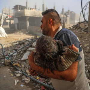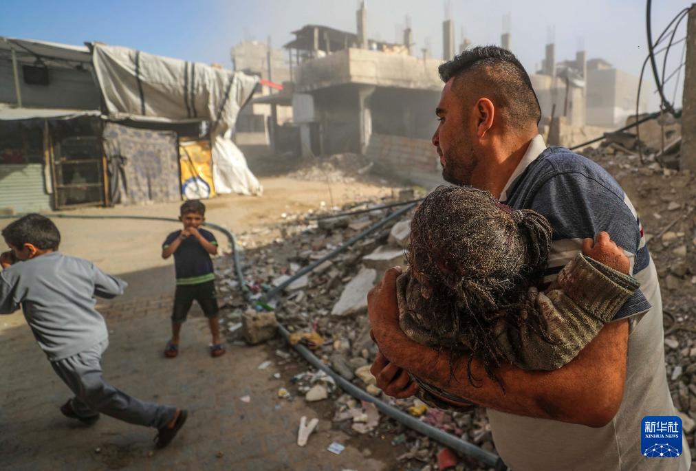 5月21日,在以军空袭加沙地带北部杰巴利耶难民营所在区域后,一名男子抱着受伤的儿童寻求救援。