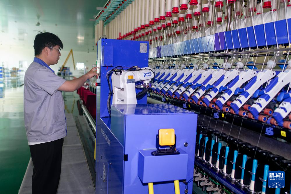 5月24日,一名工作人员在山东省日照市高新区日照品特裕华纺织科技有限公司生产厂房内操作细沙自动接头机。