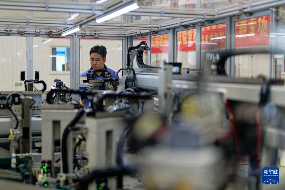 5月24日,一名工作人员在山东省日照市高新区日照品特裕华纺织科技有限公司生产厂房内监视分压器自动组装设备。