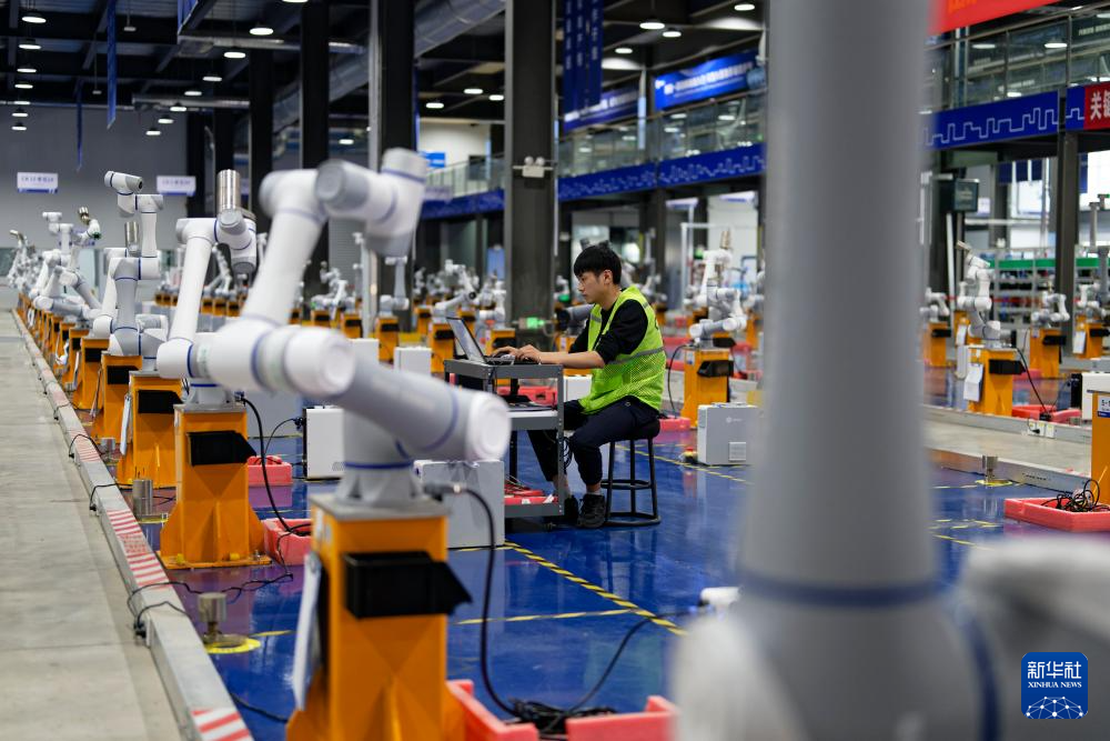 5月24日,工作人员在山东省日照市经济技术开发区越疆机器人日照生产基地对机械臂产品进行测试。