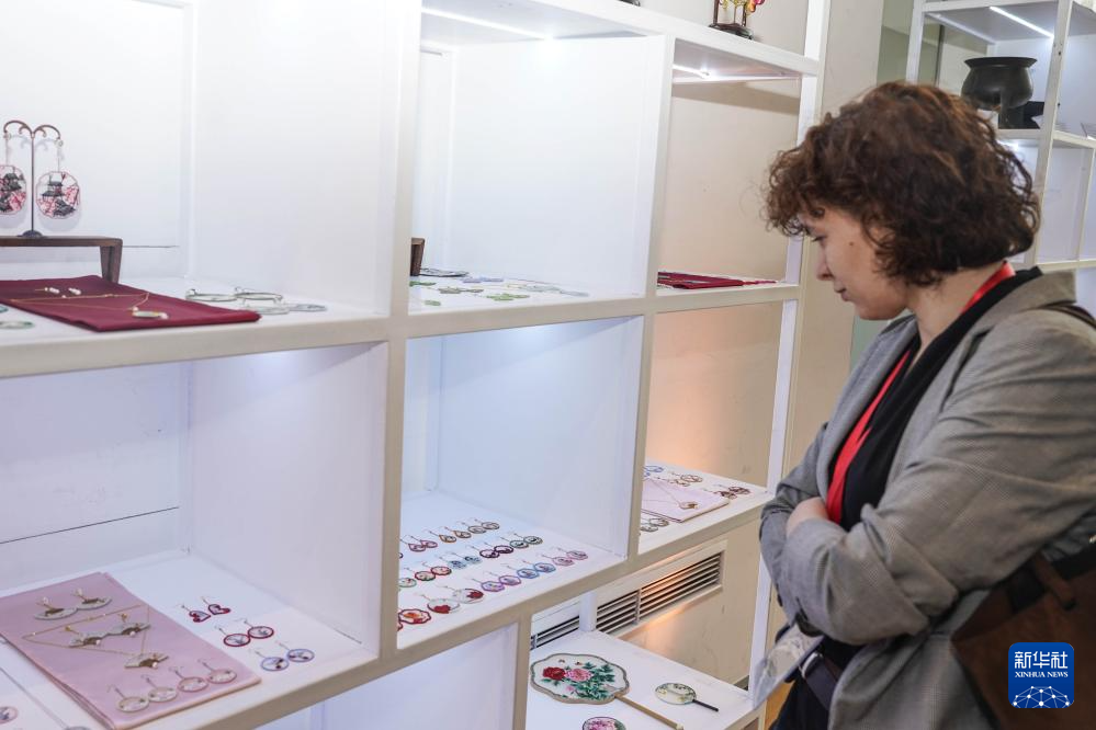 5月23日,一名女子在匈牙利布达佩斯参观中国非遗旅游文创展。