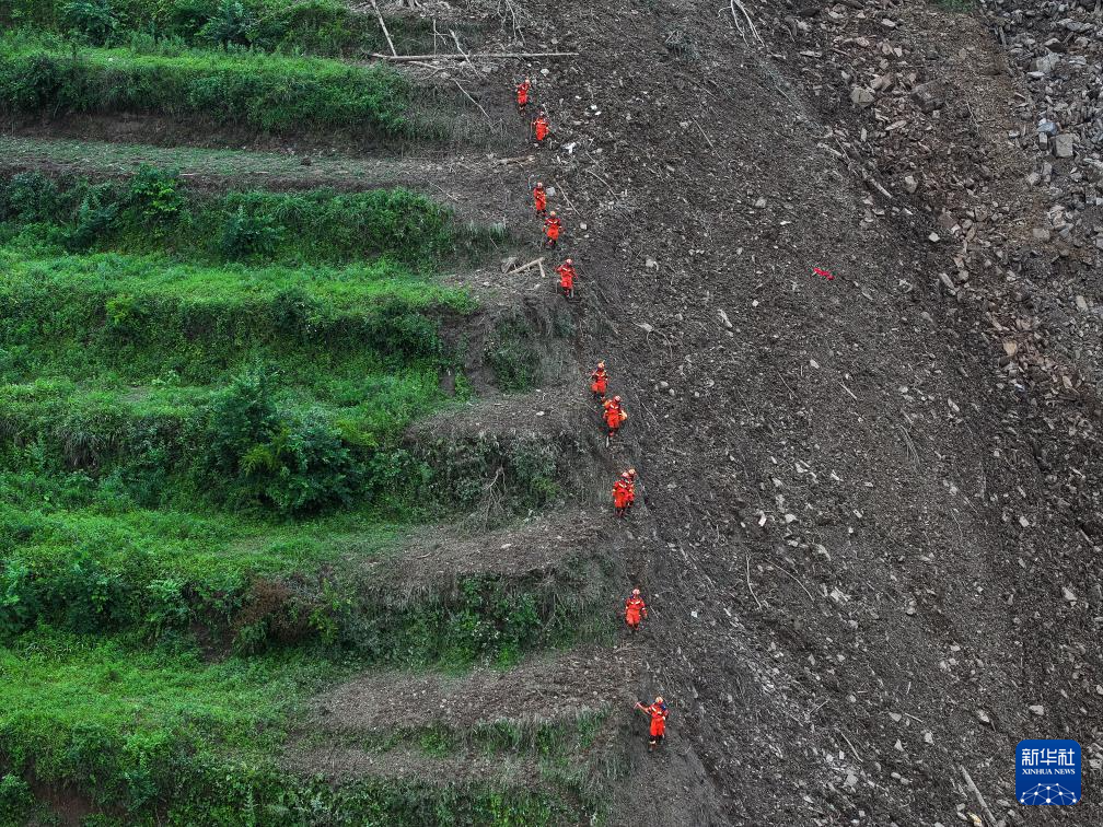 5月22日,救援人员在贵州省大方县果瓦乡庆阳村山体滑坡现场进行搜救(无人机照片)。
