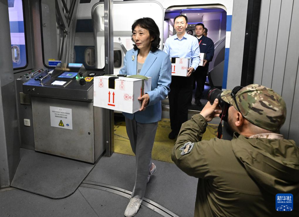 5月18日,护送文物归国的工作人员手捧装载着子弹库帛书的保护箱走出客机。