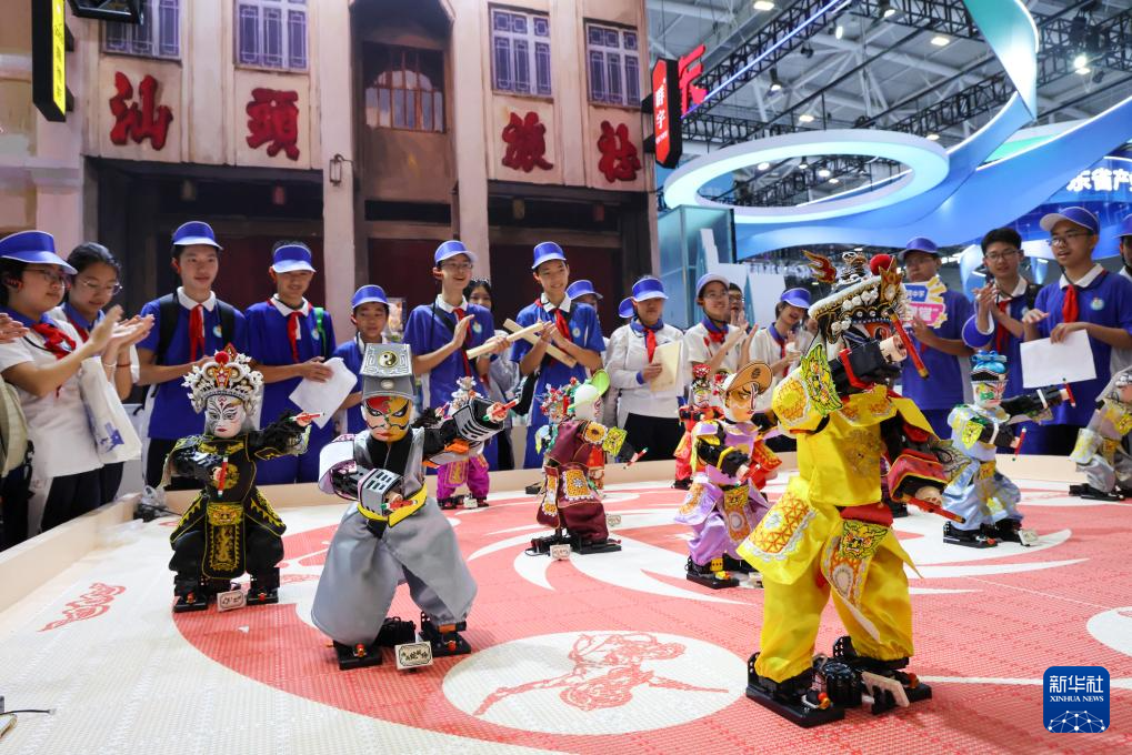 5月23日,学生在文博会上观看机器人表演英歌舞。