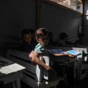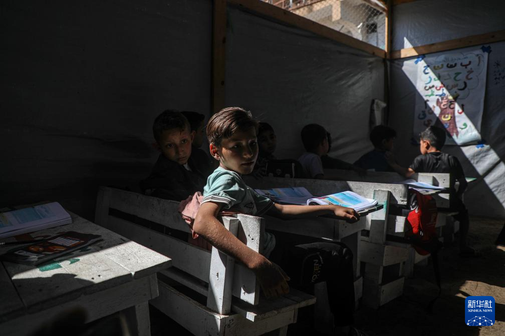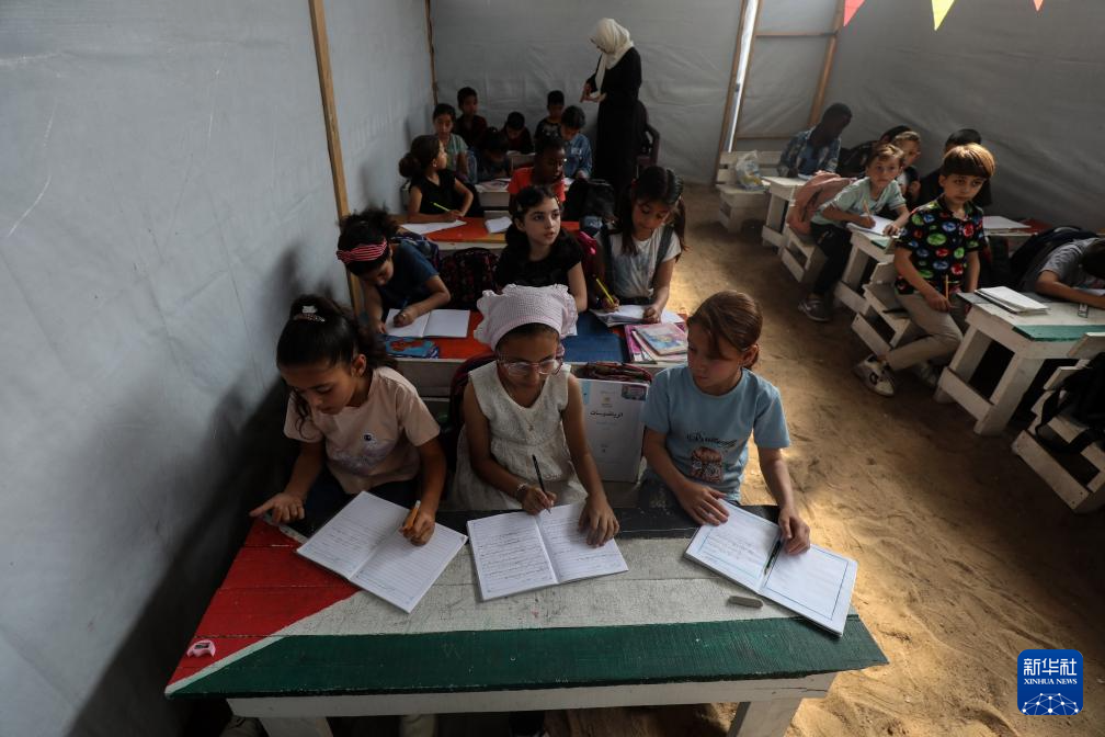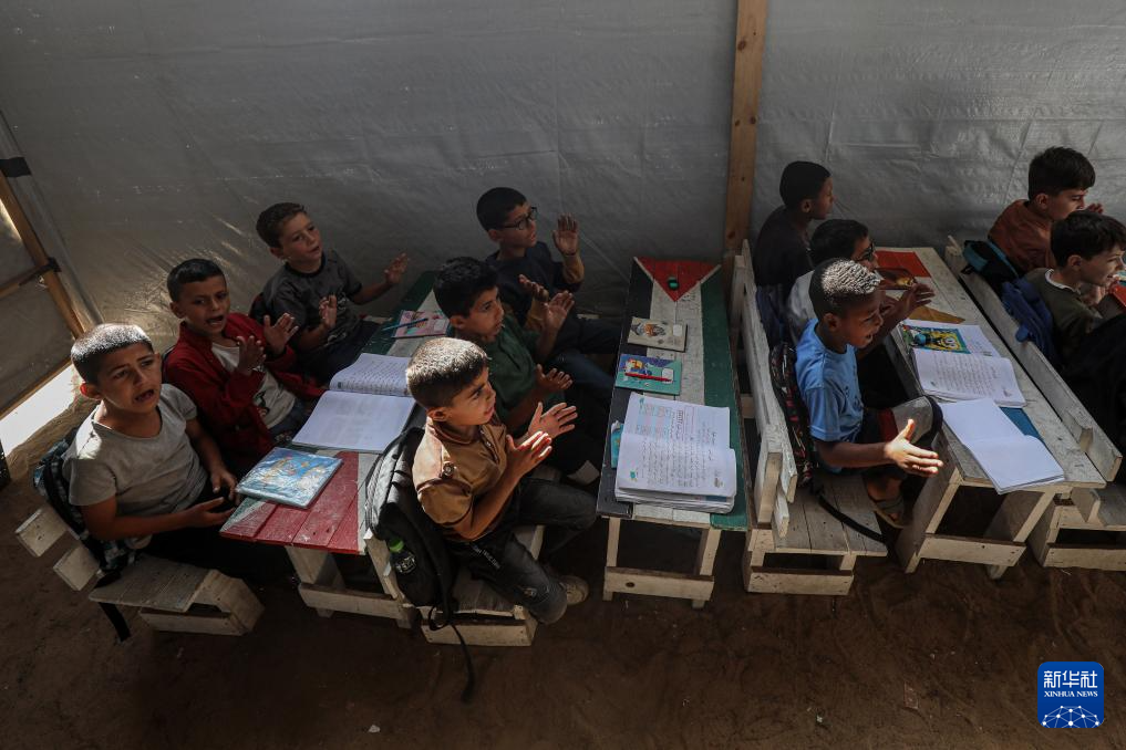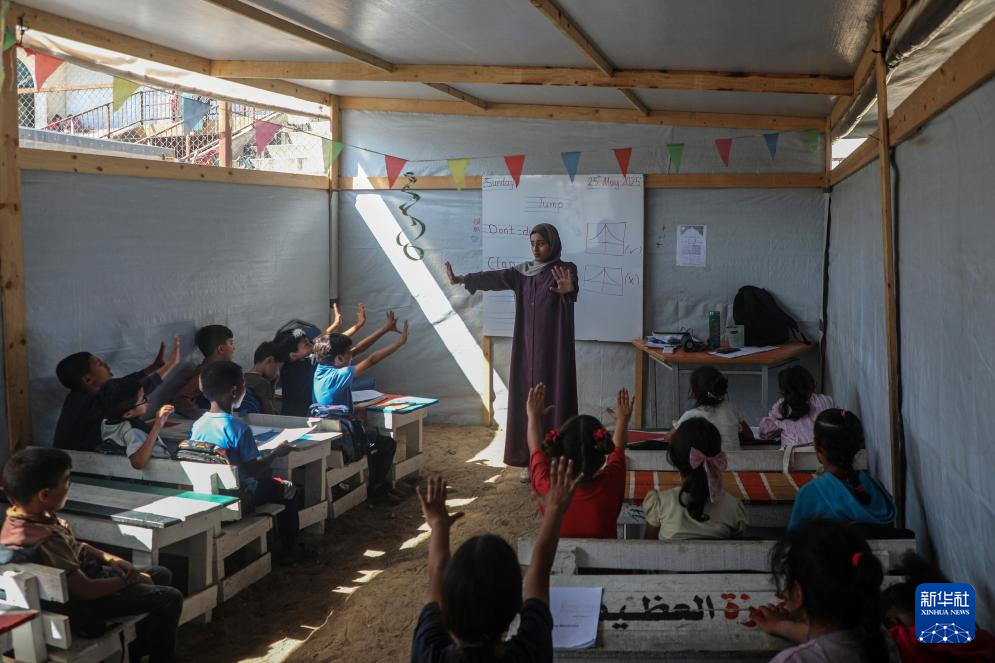5月25日,巴勒斯坦学生在加沙城一处临时帐篷里上课。