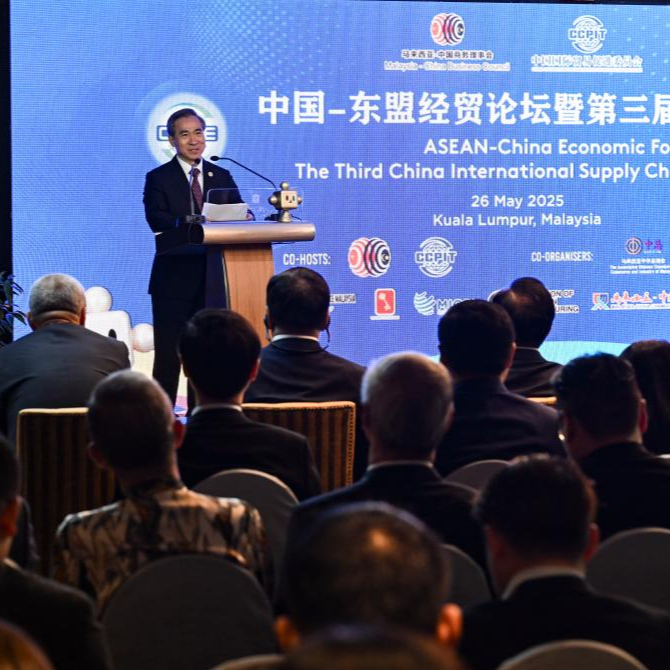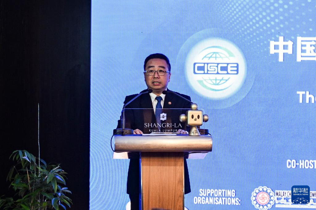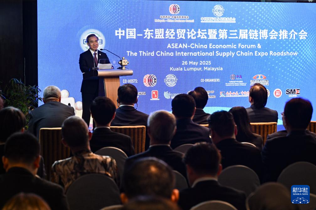 5月26日,在马来西亚首都吉隆坡,中国贸促会会长任鸿斌在中国—东盟经贸论坛暨第三届中国国际供应链促进博览会(链博会)推介会上致辞。