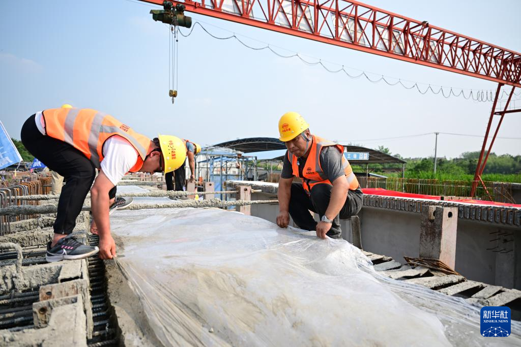 5月26日,工人在铜陵江北港铁路专用线T梁预制施工现场作业。