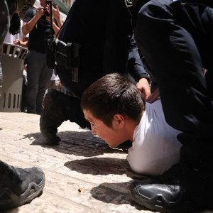 5月26日,在耶路撒冷老城举行的“耶路撒冷日”游行期间,以色列警察控制一名巴勒斯坦人。