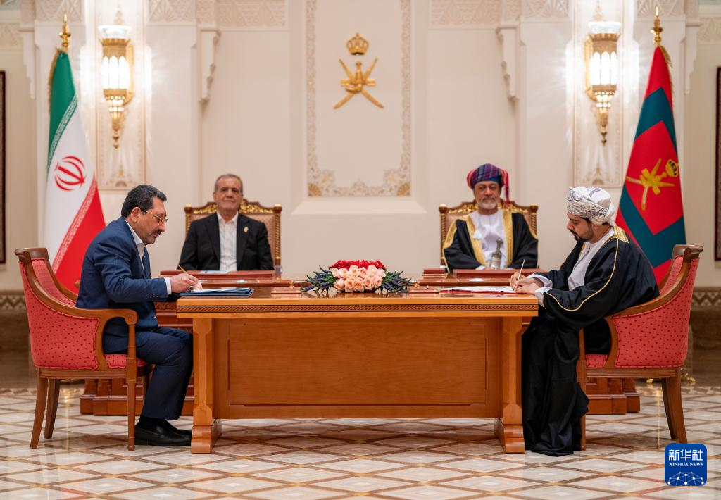 5月27日,阿曼苏丹海赛姆(后右)与伊朗总统佩泽希齐扬(后左)在阿曼马斯喀特出席合作文件签署仪式。