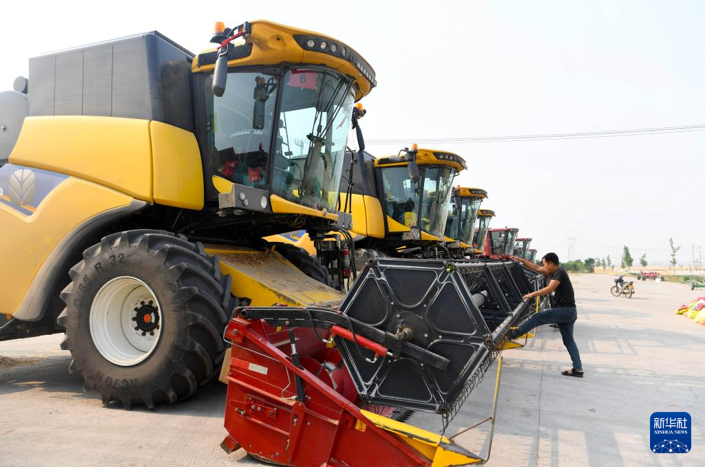 5月29日,河南省西华县黄泛区实业集团农业第四分公司农机手在检查收割机。