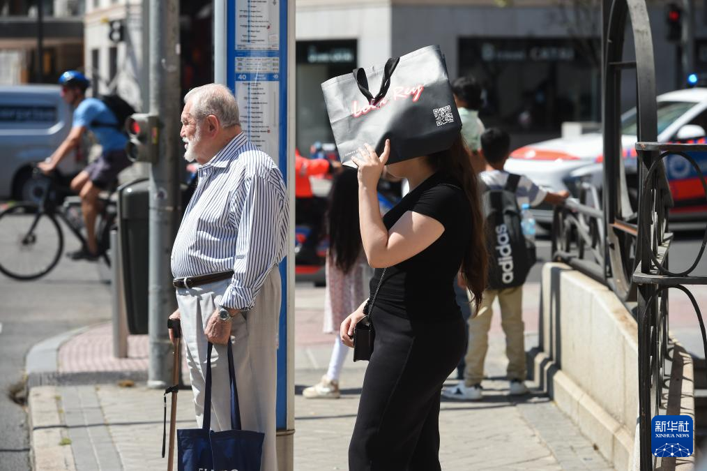 5月29日,行人在西班牙首都马德里街头用纸袋遮阳。