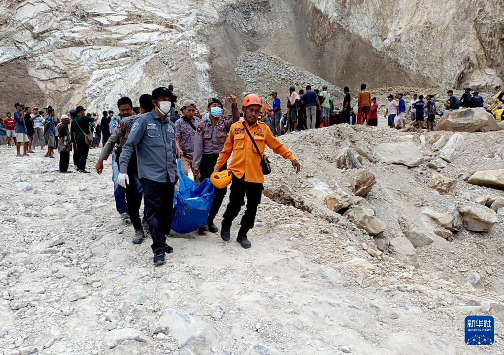 5月30日,在印度尼西亚西爪哇省井里汶,搜救人员在事发采石场转移遇难者遗体。