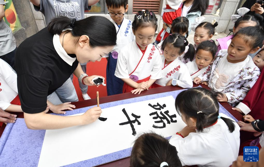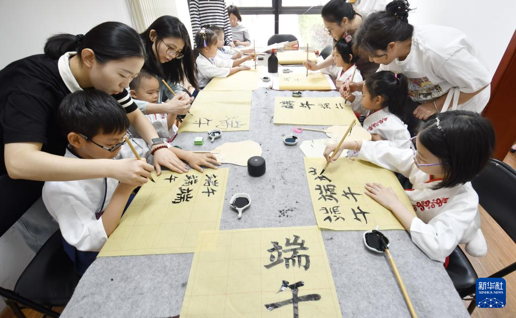 5月31日,青年路社区的孩子们在邻里共度端午节活动上学习书法。