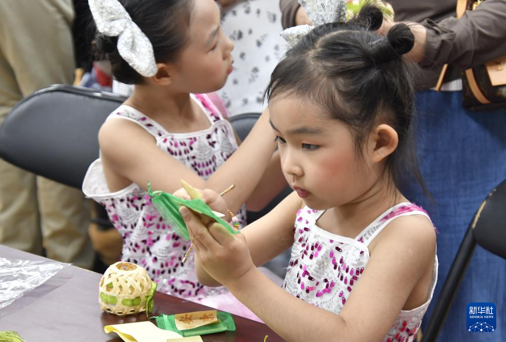 5月31日,青年路社区的孩子们在邻里共度端午节活动上制作端午节香囊。