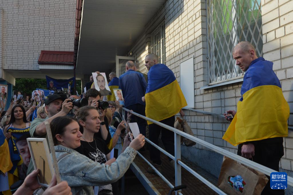 5月23日,乌克兰民众举着失踪军人照片向被释放乌军人询问下落。