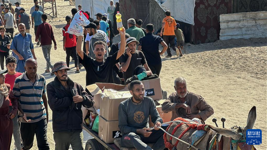 5月27日,在加沙地带南部城市拉法,民众从“加沙人道主义基金会”运营的一个物资分发中心领取救援物资(手机照片)。