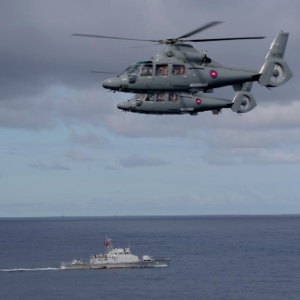 5月26日,中柬“金龙-2025”联演海空方向实兵演练在柬埔寨西哈努克港附近海空域举行,参演部队开展舰机协同训练。