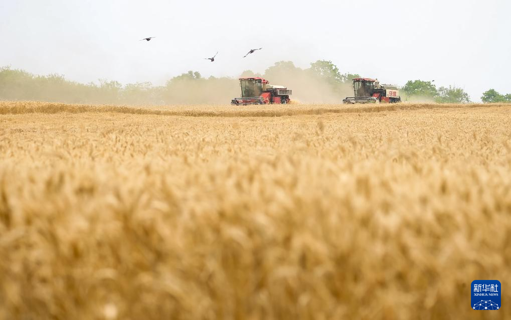 5月27日,农民驾驶收割机在江苏省句容市茅山镇何庄村收割小麦。