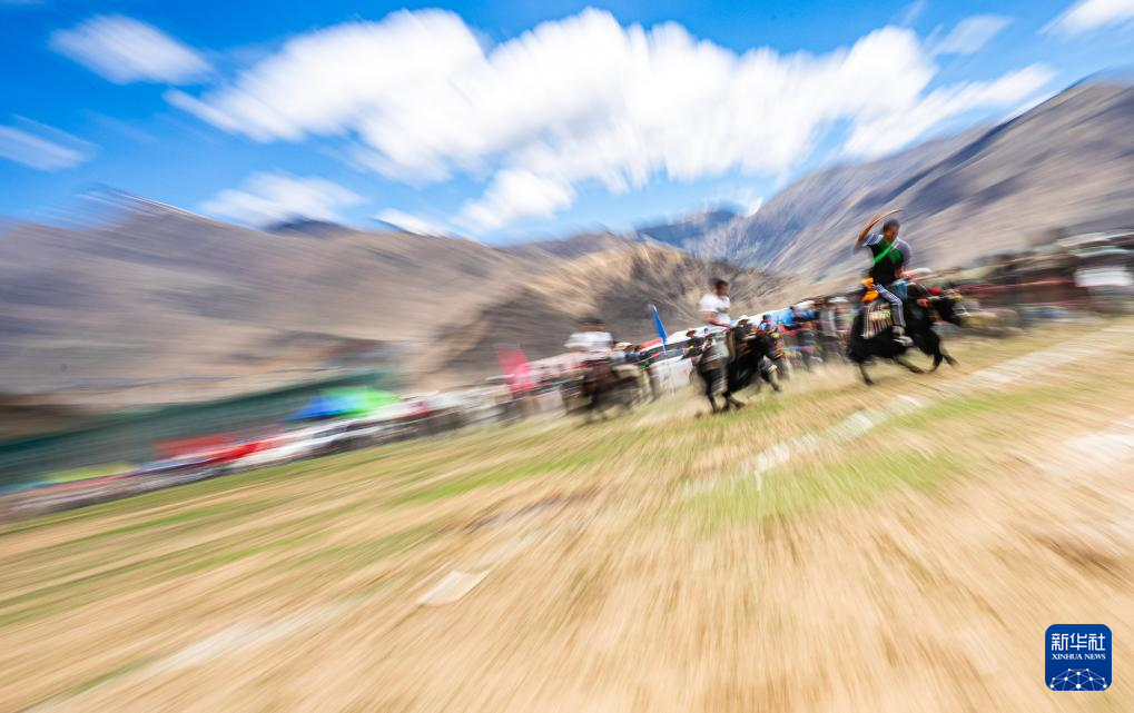5月29日,农牧民群众在拉萨市达孜区举办的2025年首届赛牦牛比赛中竞速争先。