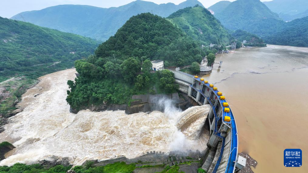 5月24日,位于湖南省郴州市桂阳县的欧阳海水库开闸泄洪(无人机照片)。