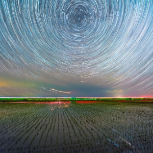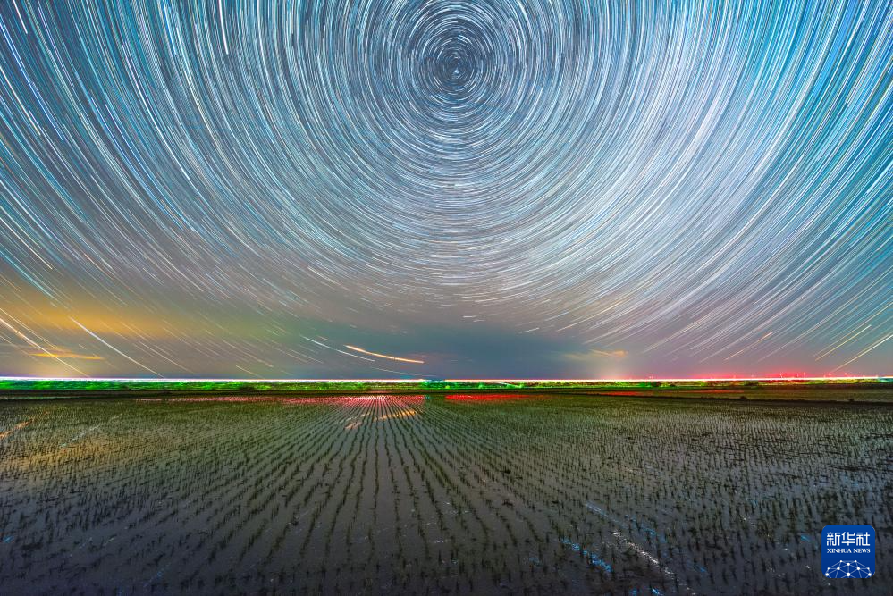 5月25日在位于黑龙江省双鸭山市的北大荒集团黑龙江二九一农场有限公司拍摄的星空下的稻田(堆栈合成照片)。