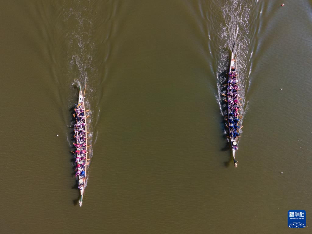 5月31日,在巴西圣保罗,人们参加龙舟赛活动(无人机照片)。