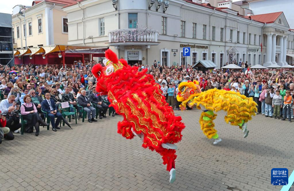 5月31日,在白俄罗斯首都明斯克,演员进行舞狮表演。