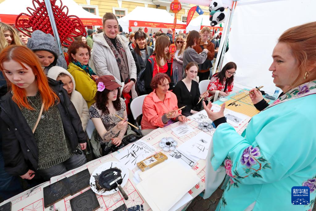 5月31日,在白俄罗斯首都明斯克,市民体验中国绘画。