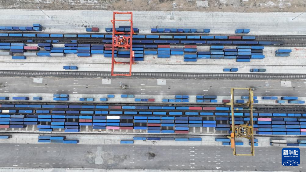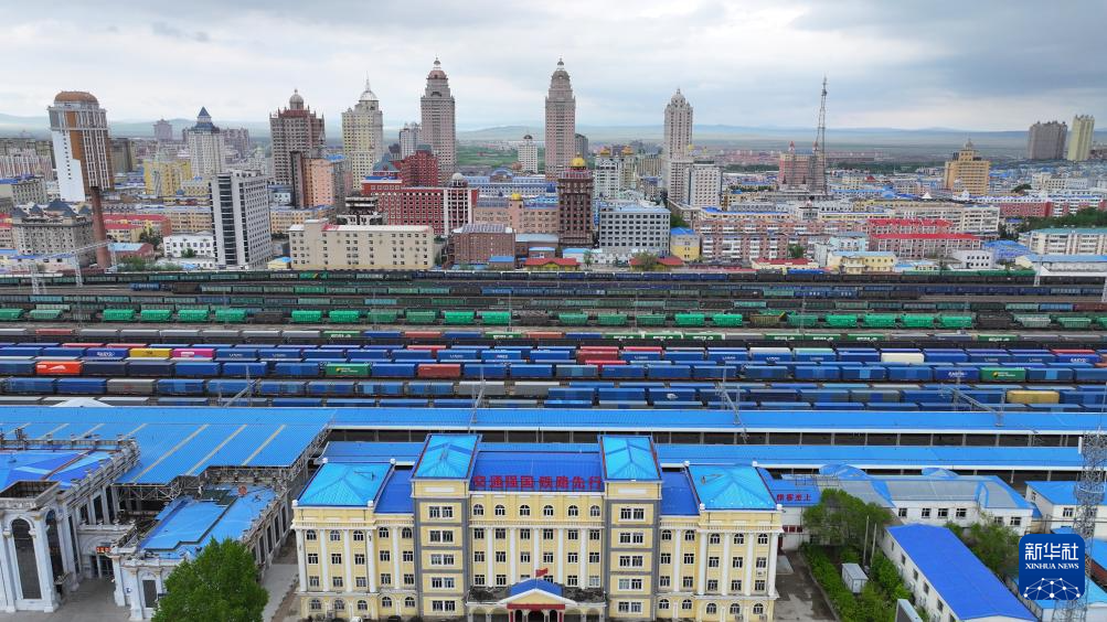5月25日,中国铁路哈尔滨局集团有限公司满洲里站国际集装箱场,回程中欧班列在进行换装作业(无人机照片)。