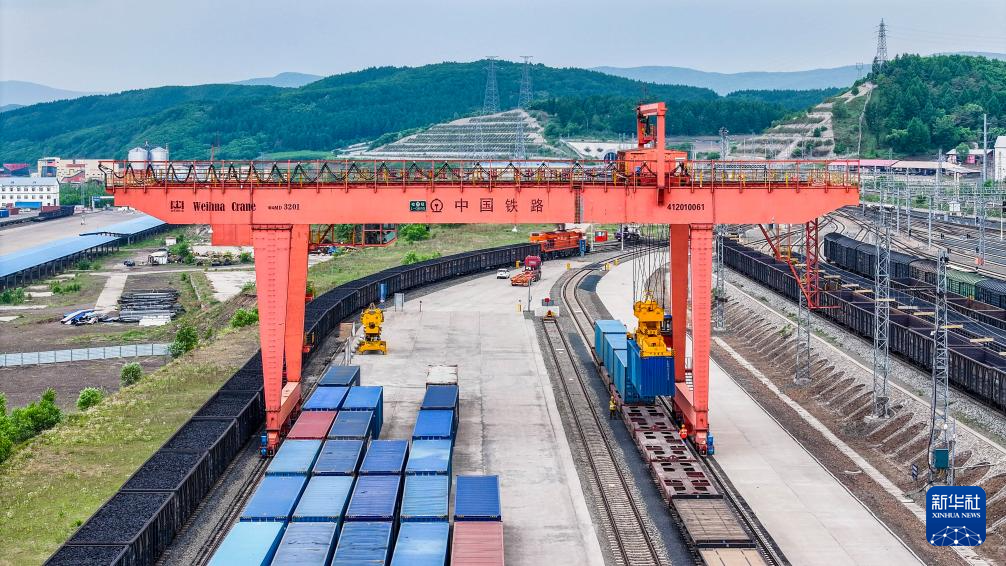 6月2日,中国铁路哈尔滨局集团有限公司绥芬河站集装箱换装场,回程中欧班列在进行换装作业(无人机照片)。