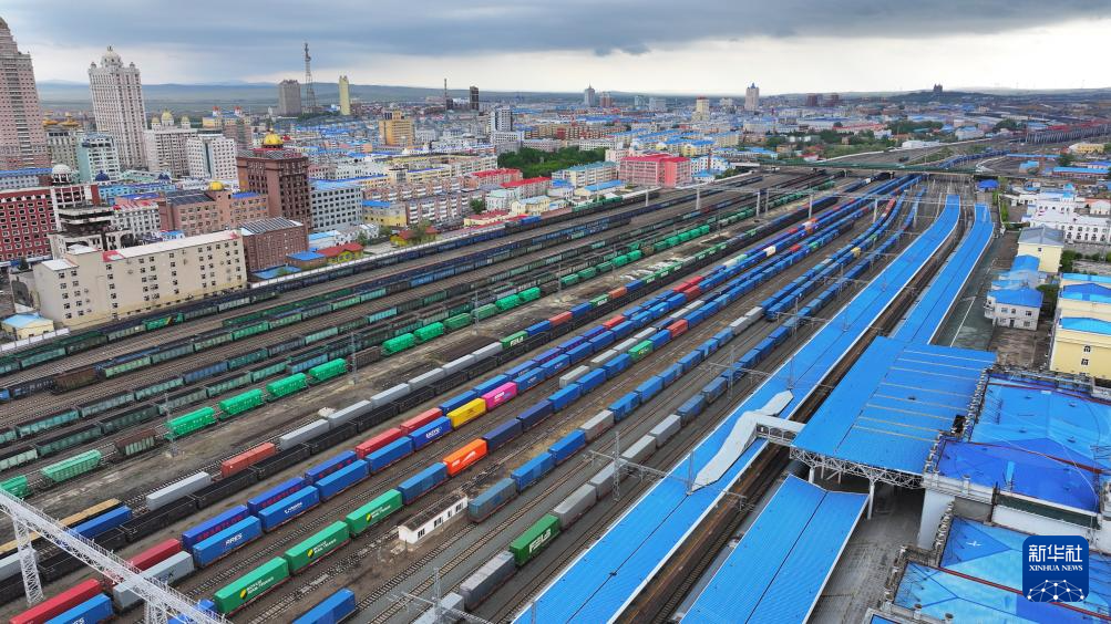 6月2日,中欧班列在中国铁路哈尔滨局集团有限公司满洲里站编组场内等待发车(无人机照片)。