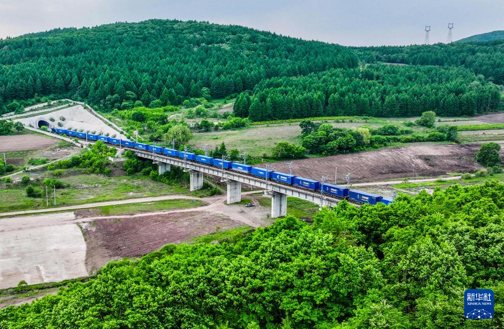 6月2日,一回程中欧班列从中国铁路哈尔滨局集团有限公司绥芬河站驶向山东方向(无人机照片)。
