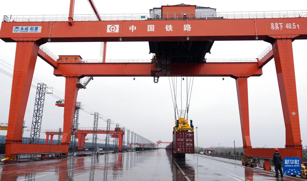 5月9日,黑龙江同江北站换装场内,装卸作业人员冒雨进行中欧班列集装箱换装工作。
