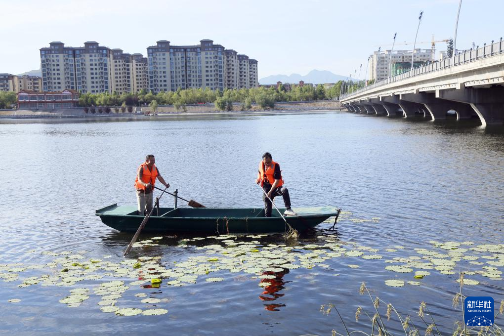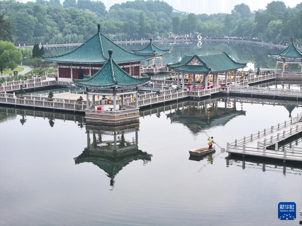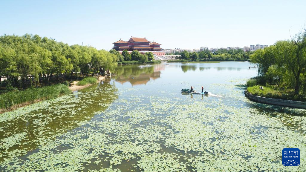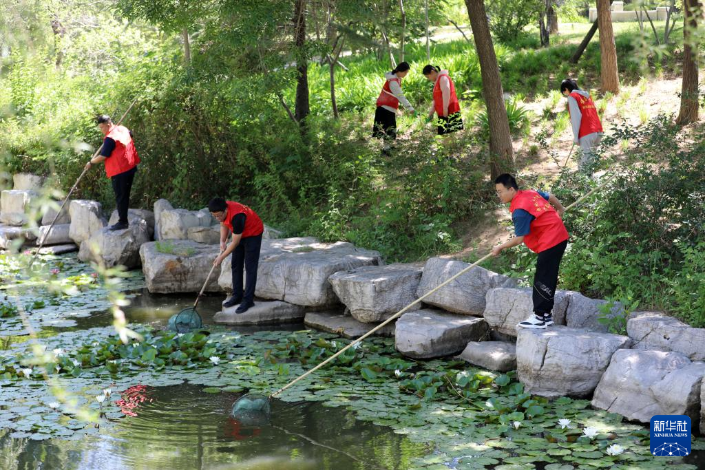 6月4日,志愿者在河北省唐山市丰润区曹雪芹公园打捞水面漂浮物(无人机照片)。