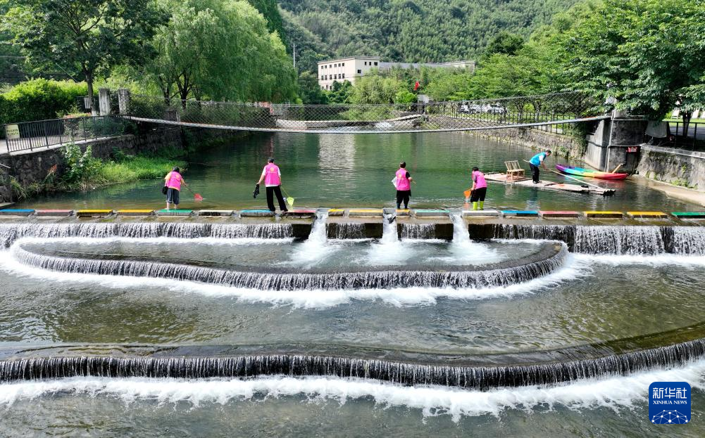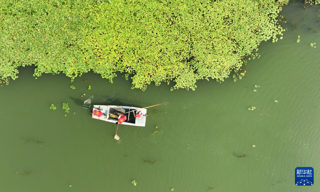6月4日,志愿者在浙江省湖州市德清县莫干山镇佛堂村巡河护水、打捞河面漂浮物(无人机照片)。