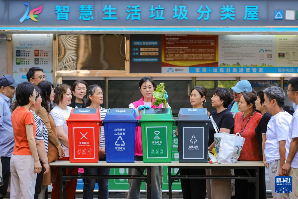 6月4日,在山东省青岛市李沧区浮山路街道旭东社区,宣讲员为居民讲解垃圾分类知识。