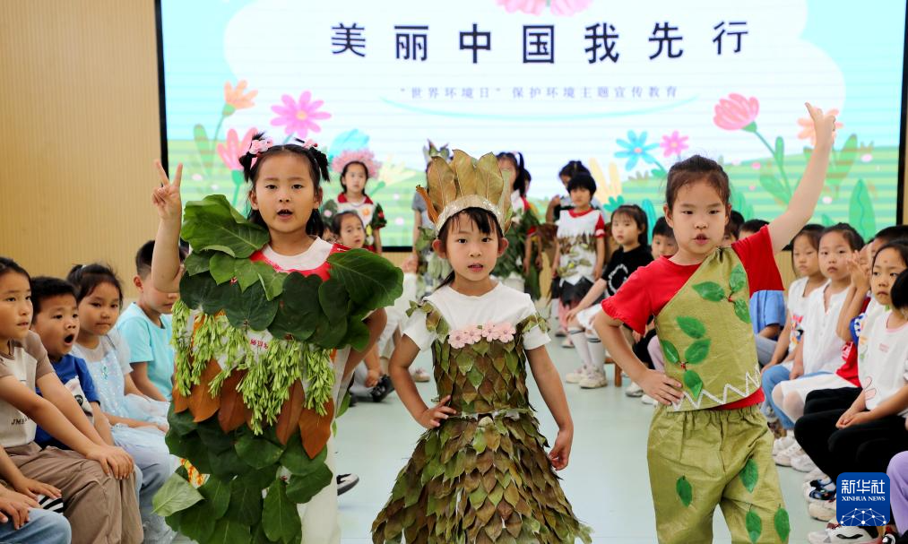 6月4日,山东省东营市东营区文苑幼儿园“环保时装秀”主题活动中,孩子们身穿用树叶等材料制成的环保服装进行展示。