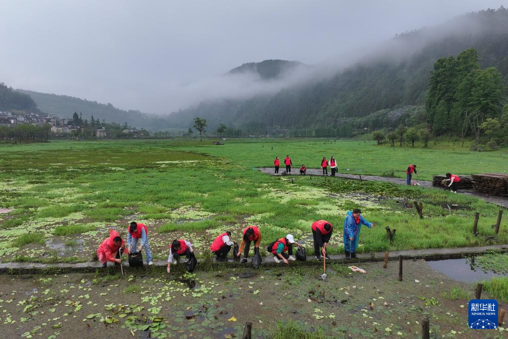 6月4日,新时代文明实践志愿者在云南省腾冲市西源街道盈水村湿地公园清理垃圾(无人机照片)。