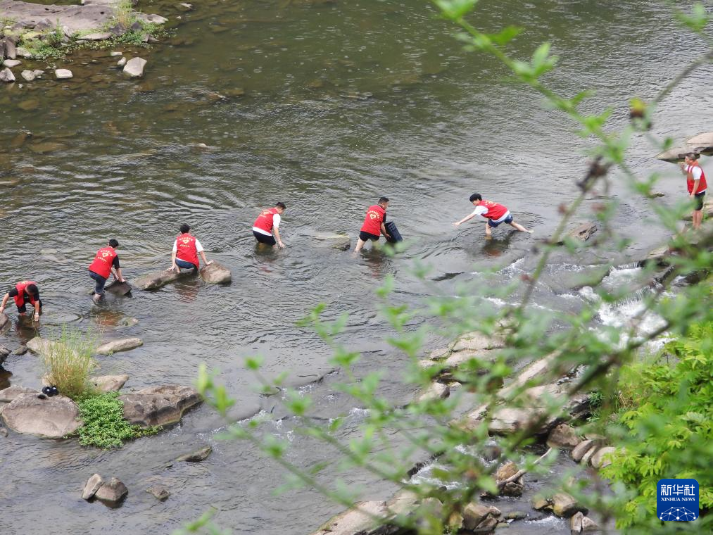 6月4日,在四川省达州市通川区磐石镇明月江畔,环保志愿者在捡拾垃圾。