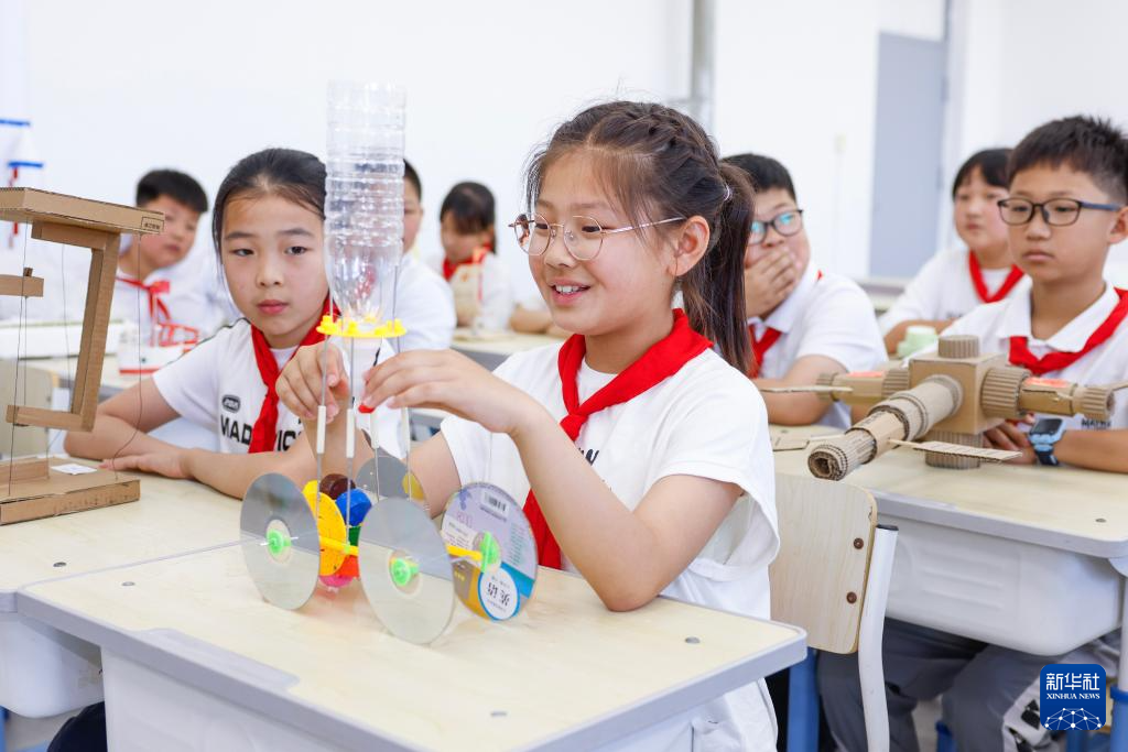 6月4日,在河北省唐山市丰南区岔河小学,学生们操作用废品制作的科技小作品。