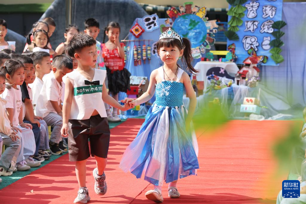 6月4日,在浙江省湖州市德清县乾元镇第一幼儿园,小朋友身穿用废旧材料制成的服装走秀。