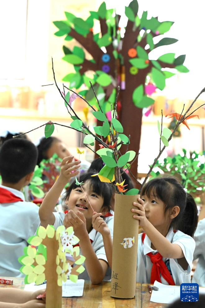 6月4日,在河北省石家庄市柏林庄学校开展的“美丽中国我先行”保护环境主题活动中,学生们利用废弃物料制作“环保树”。
