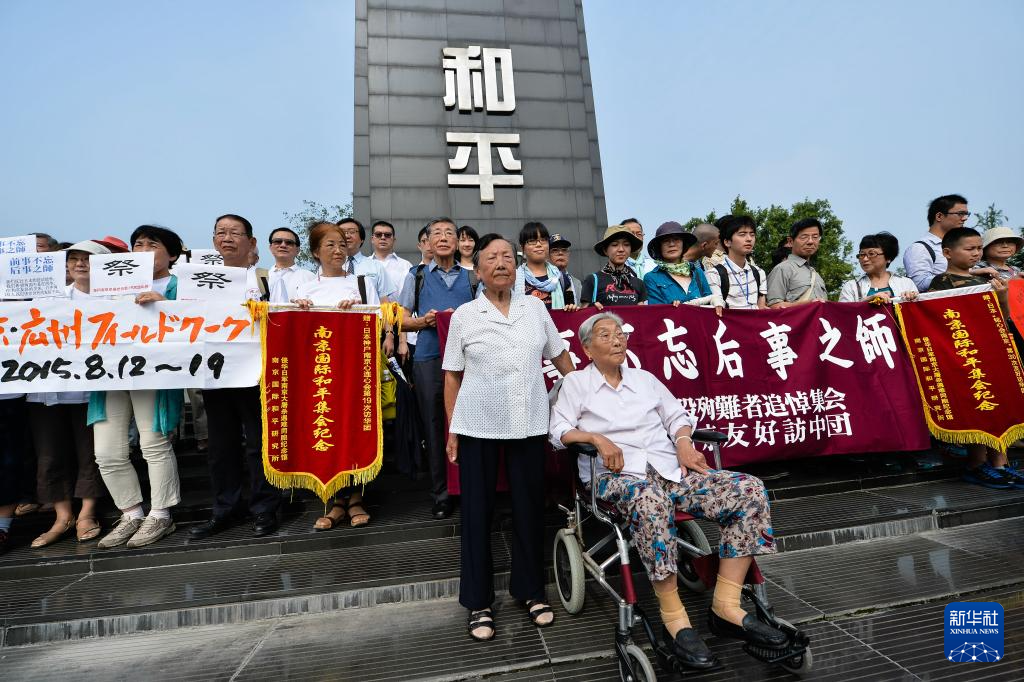 2015年8月15日,在侵华日军南京大屠杀遇难同胞纪念馆和平公园举行的国际和平集会上,南京大屠杀幸存者代表夏淑琴(前左)、陈桂香(前右)和日本友好团体成员合影。新华社记者 季春鹏 摄pagebreak
