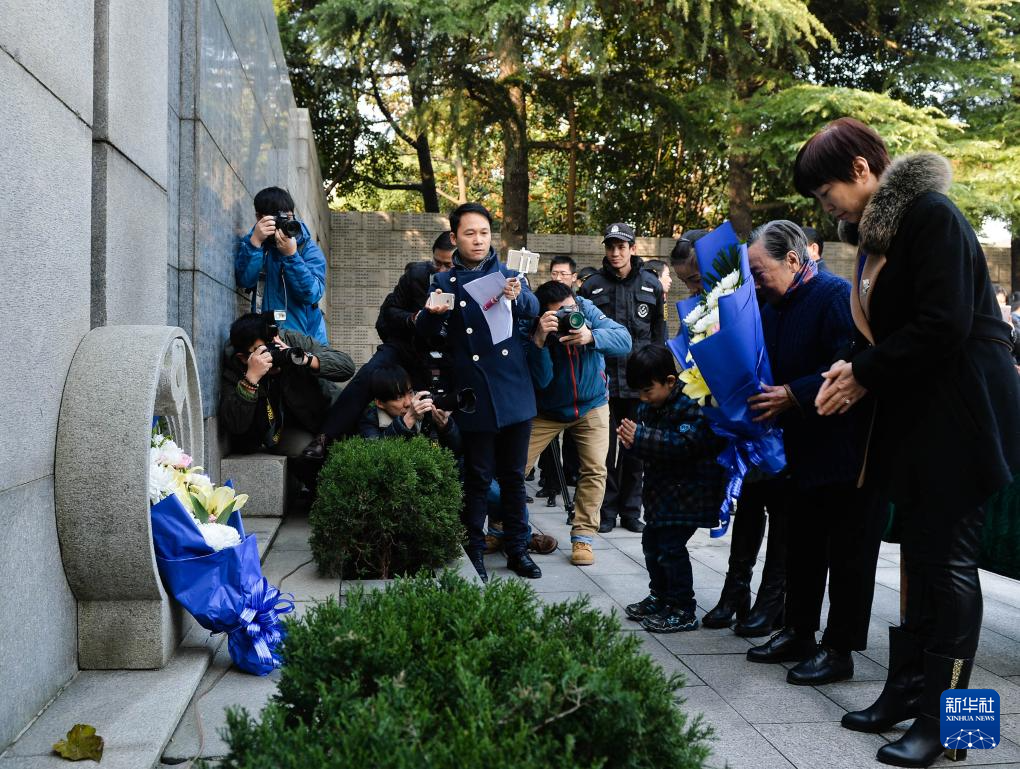 2016年12月3日,夏淑琴(右二)和家人在侵华日军南京大屠杀遇难同胞纪念馆向遇难者献花。新华社记者 季春鹏 摄pagebreak